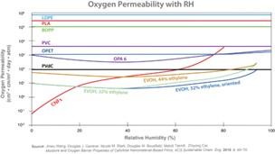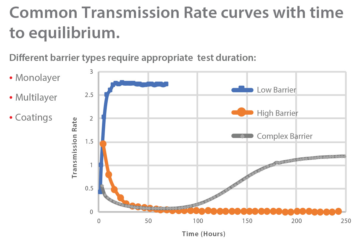 传输速率输出是 OTR 与时间的关系图(这是验证平衡的关键)和数据报告。透射率测试持续时间可以从几个小时到几周不等,具体取决于材料的阻隔特性。高温会导致更高的传输速率和更快的测试,而低温会产生更低的传输速率值和更长的测试持续时间。此外,对湿度敏感的样品(例如 EVOH、聚酰亚胺和涂层纸)的 OTR 会受到湿度的影响。了解您产品的需求对于优化适当的测试环境非常重要。