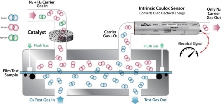 - 穿过样品的任何传输氧气都会被氮气吹至库仑检测器,在库仑检测器中测量传输氧气。